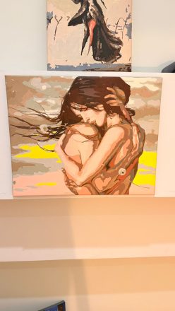 Vuslat modelini boyamak hem çok duygusal hem de çok keyifliydi. Sarılmanın verdiği sıcaklık ve fondaki gün batımı tonları tabloya inanılmaz bir his katıyor; bitince gerçekten “hikâyesi olan” bir çalışma gibi duruyor. Ten tonlarındaki geçişler ve saç detayları da beklediğimden çok daha güzel çıktı.